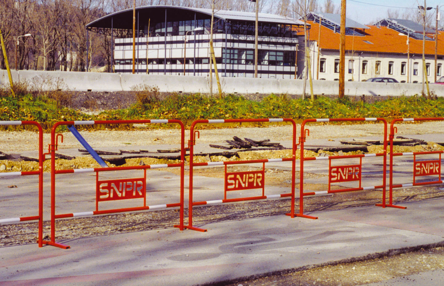 Barrière agréée pour la sécurité des chantiers. Tube acier cintré, Ø 30 x 1,5 mm, très résistant. Montage rapide en linéaire ou en angle. Une plaque centrale d'identification 330 x 330, ou 200 x 500 mm. Deux lisses horizontales. Longueur 1,50 m, hauteur 1,00 m. Attache coulissante brevetée assurant la liaison des barrières quelle que soit la pente du terrain, ou sa rupture jusqu'à 200 mm. Ouverture immédiate des barrières par simple relevage de l'attache.