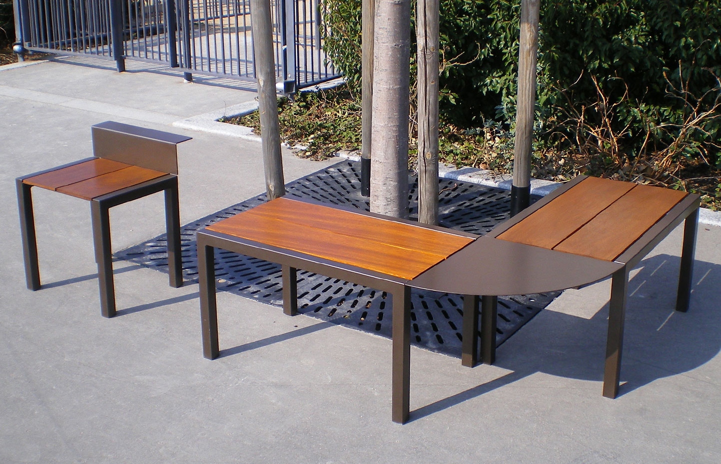 Ensemble de banquettes, fauteuils, et table basse, à combiner pour créer différents espaces d'échange, et de convivialité, en environnement intérieur (salles d'attente, halls d'accueil...), comme en extérieur (place publique, voirie, parcs et jardins...). Les pièces d'adaptation permettent de placer les différents éléments en linéaire, en angle, dans des configurations combinables à l'infini. Structure en acier, assise en bois exotique traité et lasuré. Finition plastifiée teinte RAL au choix. Capacité 1 ou 2 places par élément.